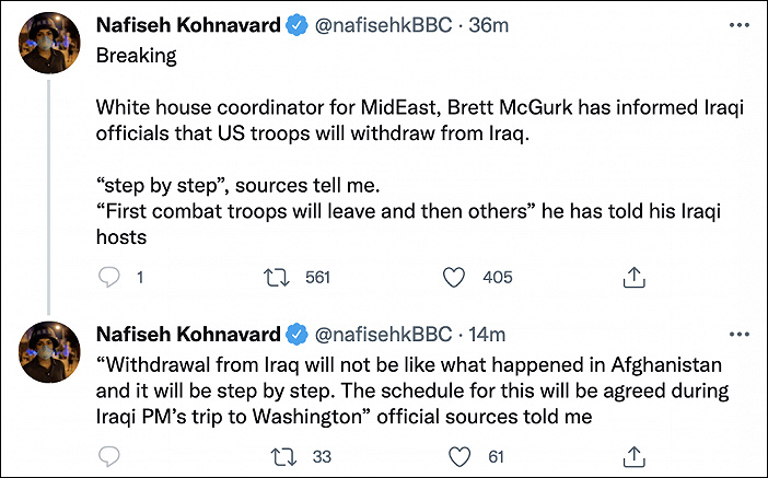 這一消息最早是BBC記者在推特上“爆料”的。英國廣播公司(BBC)國際頻道中東記者納費塞·科納瓦特(Nafiseh Kohnavard)7月14日,發推披露稱,美國白宮國家安全委員會中東和北非協調員佈雷特·麥格克(Brett McGurk)已通知伊拉克官員,美國將從伊拉克“撤走全部作戰部隊”。