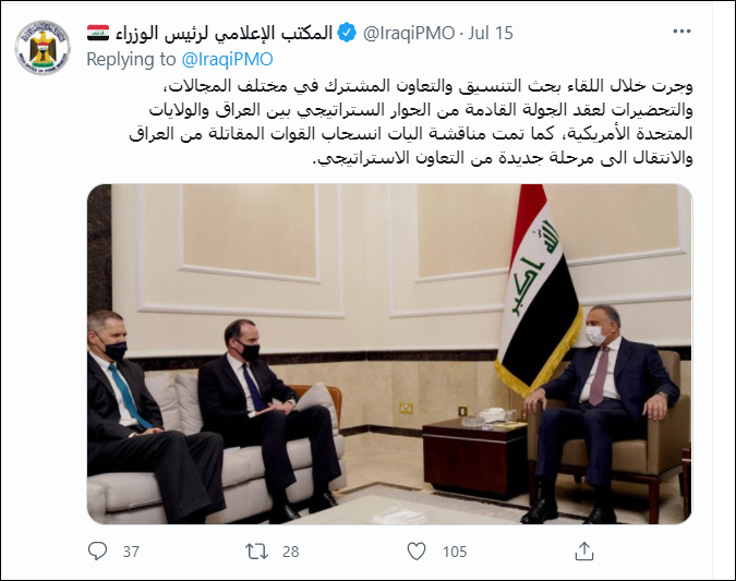 隨後伊拉克政府在一份聲明中證實了美伊商討撤軍一事,伊拉克總理辦公室15日發推稱:“雙方就(美國)作戰部隊從伊拉克撤軍的機制進行了討論,並將戰略合作推進到新的階段。”