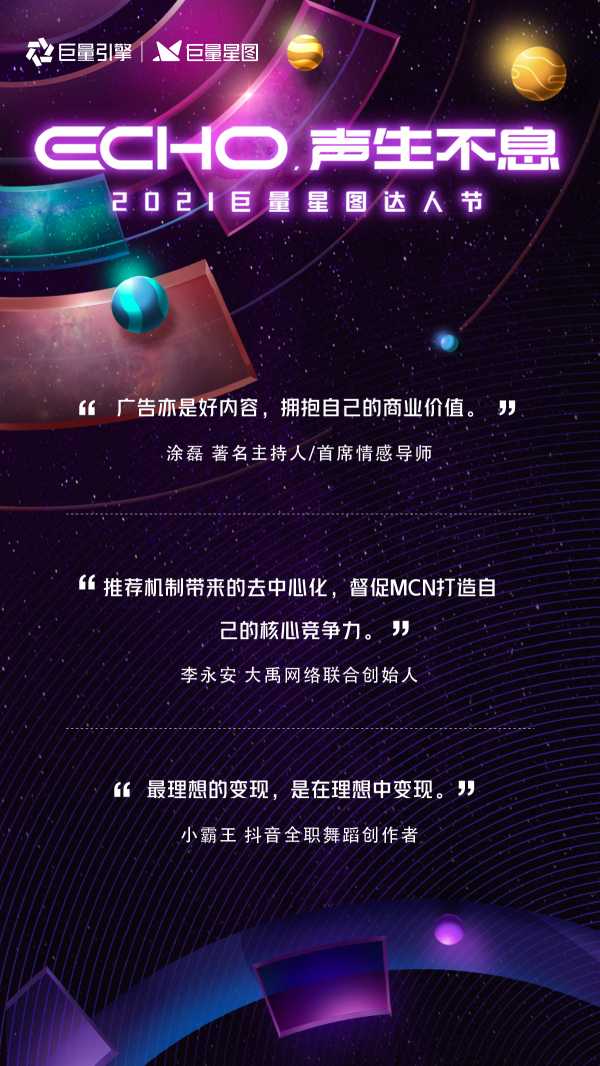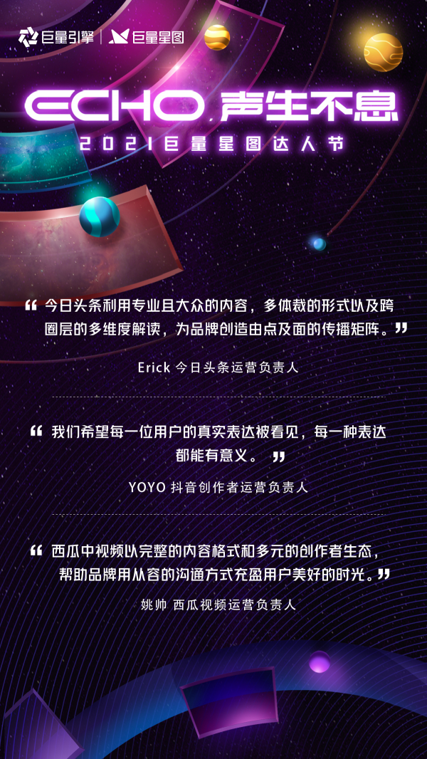 7月15日,以"ECHO,聲生不息"為主題的2021巨量星圖達人節在上海舉行。巨量星圖基於達人營銷行業新語言、新規模、新土壤,發佈平台的新定位、新使命、新角色;並推出百億扶持計劃,通過100億的商單和流量資源,定向扶持達人營銷生態。巨量星圖期待在超大規模的達人營銷生態中創造最優解,形成生態各方共贏。