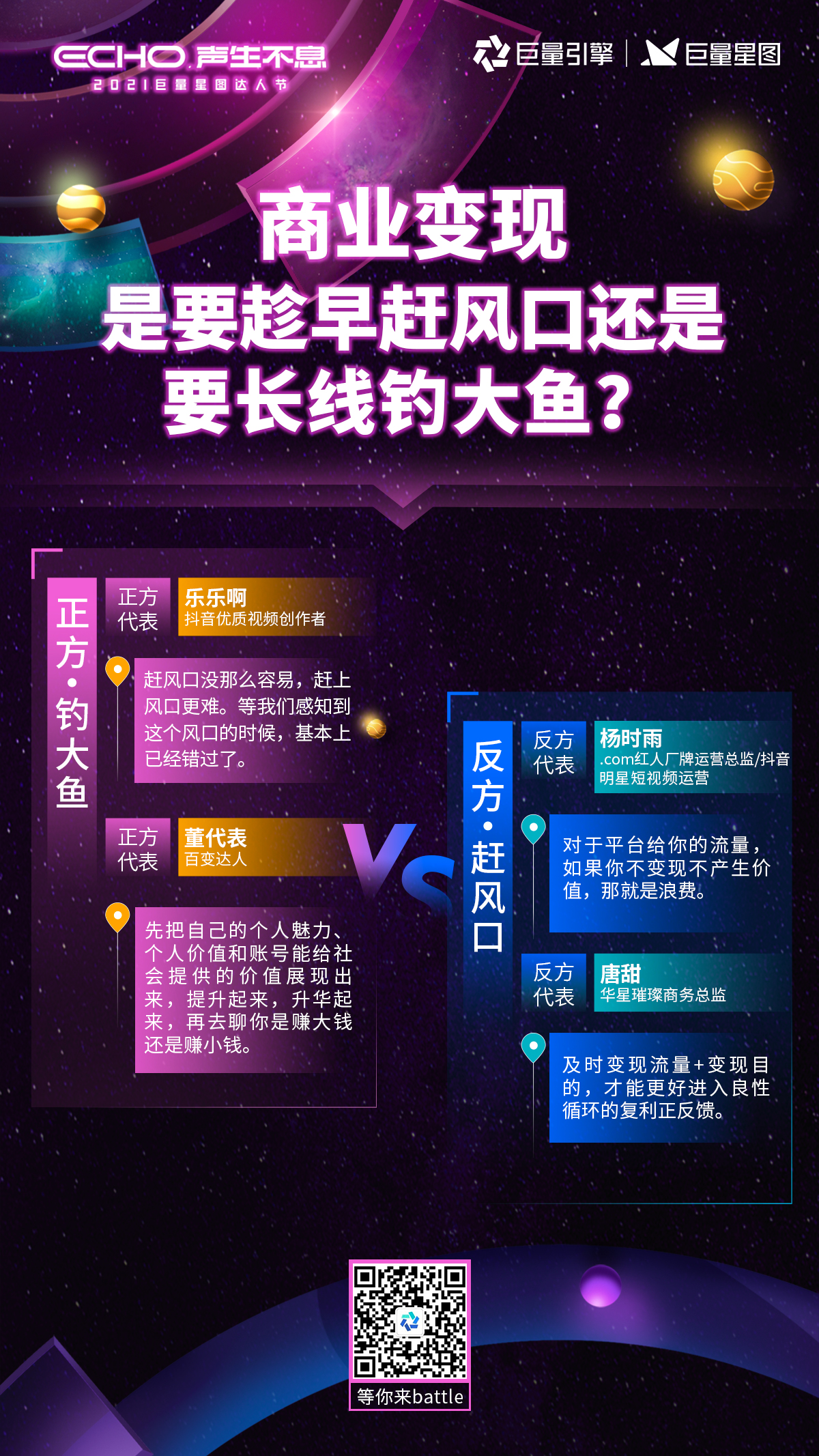 達人營銷行業繁榮發展背後,亦是百家爭鳴。對於行業中諸多尖鋭又現實的問題,達人、MCN機構、品牌主該如何解答?在battle環節,多位來自行業不同角色不同視角的行業大咖,在激烈的交流中碰撞出新觀點,在熱烈的環境下探索新時代的方向。
