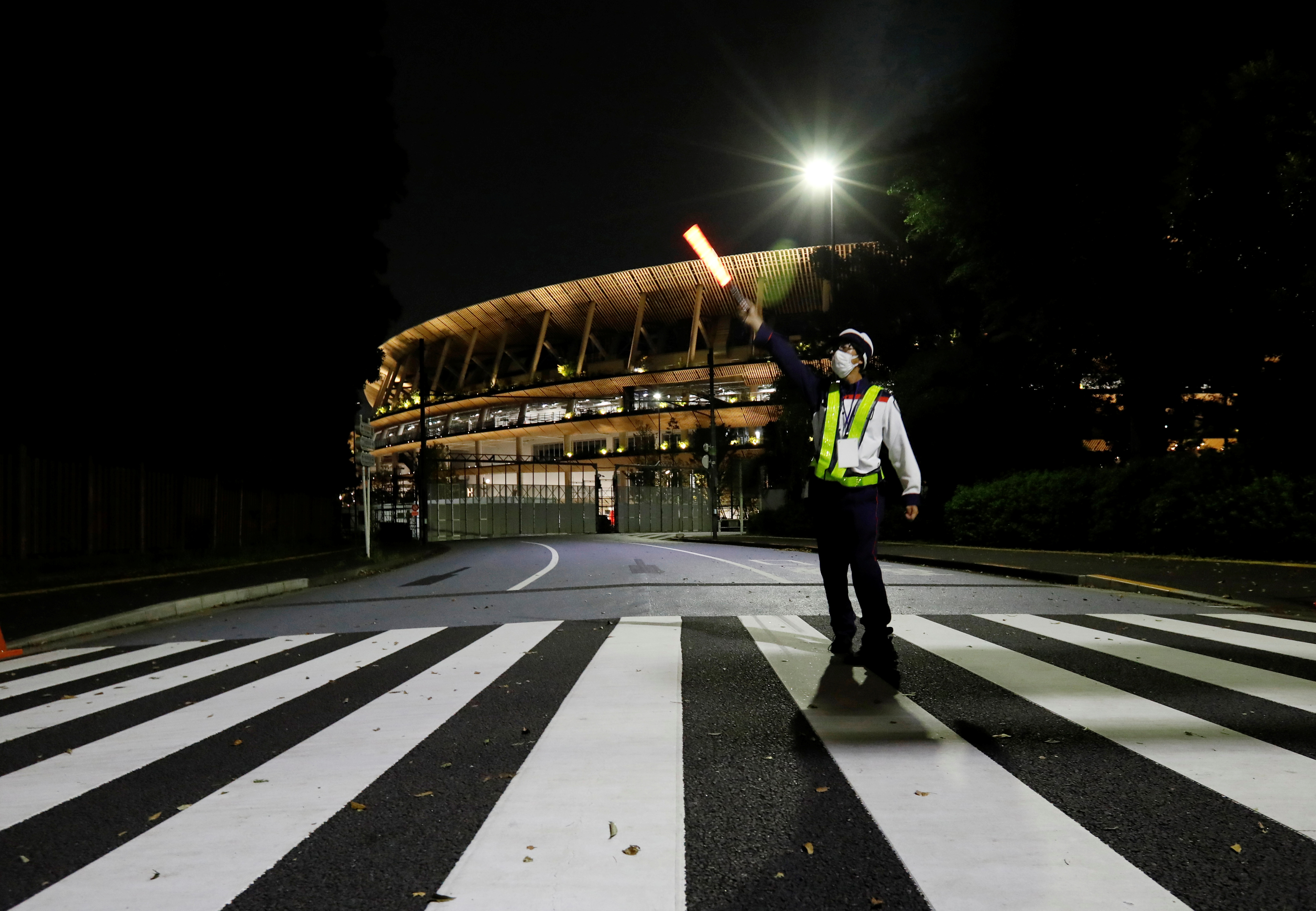 當地時間2021年7月12日,日本東京,一名戴着防護面具的保安在2020年東京奧運會和殘奧會的主體育場--國家體育館前站崗 圖源:澎湃影像