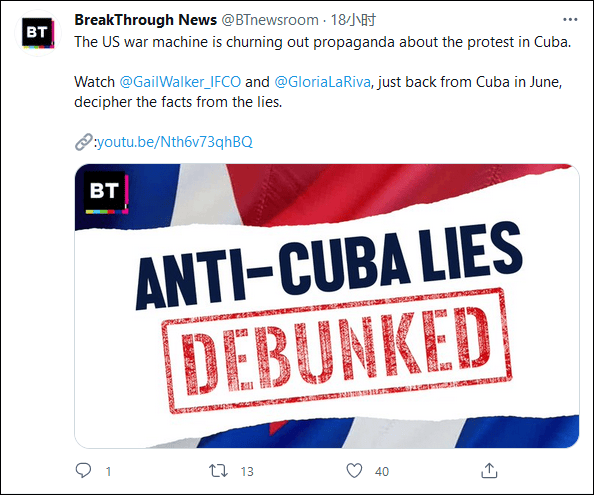 在許多議題上,這家媒體的立場不同於其他國外媒體,經常站在西方世界的“對立面”思考問題。比如,在今年年初美國亞裔頻遭仇恨犯罪襲擊時,該媒體的視頻報道將問題根源直指美國國內空前高漲的反華宣傳;而在近期古巴多地出現反政府示威後,該媒體又發現美國主流媒體和好戰勢力正大肆宣傳這一事件。
