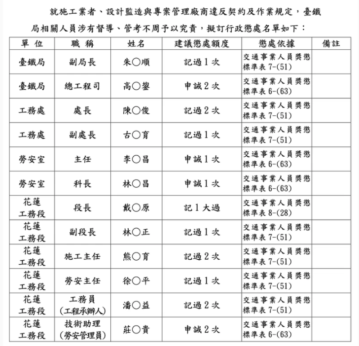 事故追責名單也同時公佈,與先前結果一致,最高責任人只到台鐵副局長朱來順,懲處為記過1次。
