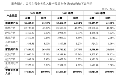 從收入結構上看,公司主營業務來源於傢俱類產品和家紡類產品兩大業務板塊,具體構成如下: