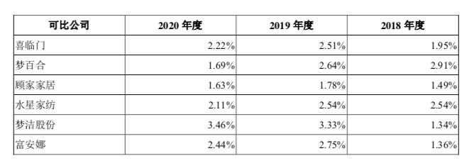 同時,趣睡科技的毛利率水平也在同行中墊底。2020年,喜臨門、夢百合、顧家家居、水星家紡、夢潔股份、富安娜、羅萊生活、趣睡科技的毛利率分別為33.76%、33.92%、35.21%、35.27%、39.94%、53.9%、43.18%、27.89%,近三年趣睡科技毛利率均低於行業可比公司均值。