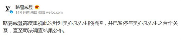 @路易威登 19日晚發佈消息,路易威登(LOUIS VUITTON)高度重視此次針對吳亦凡先生的指控,並已暫停與吳亦凡之合作關係,直至司法調查結果公佈。