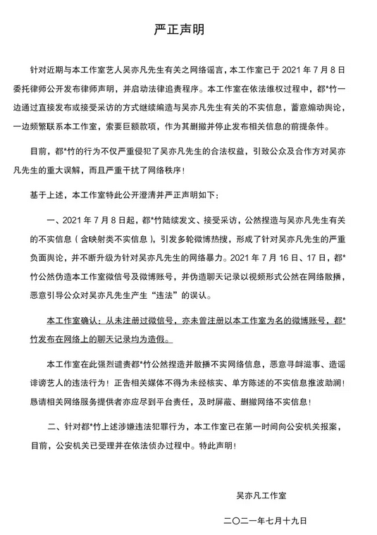 面對指控,7月19日上午,吳亦凡發佈聲明進行了否認:沒有灌酒、沒有收手機、更沒有她描述的各種“細節”,從來沒有過什麼“選妃”!沒有“誘姦”“迷姦”!沒有什麼“未成年”! 其工作室也發聲明稱,都美竹編造不實信息,索要鉅額款項等行為涉嫌違法犯罪,工作室已在第一時間報案,公安機關已受理並在依法偵辦過程中。