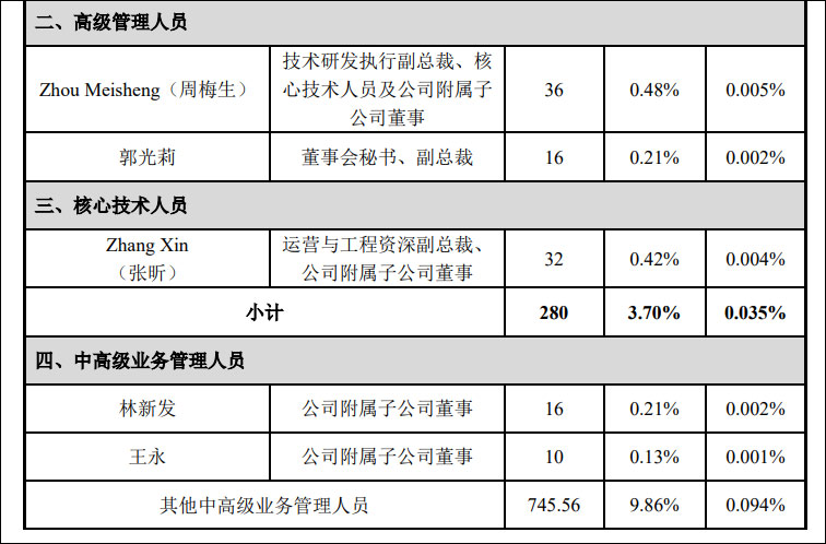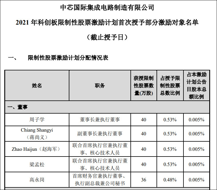 中芯國際公告披露,本次股票激勵計劃的具體分配對象主要為董事、高級管理人員、核心技術人員、中高級業務管理人員和技術及業務骨幹人員,佔該公司總人數17354人的23%。