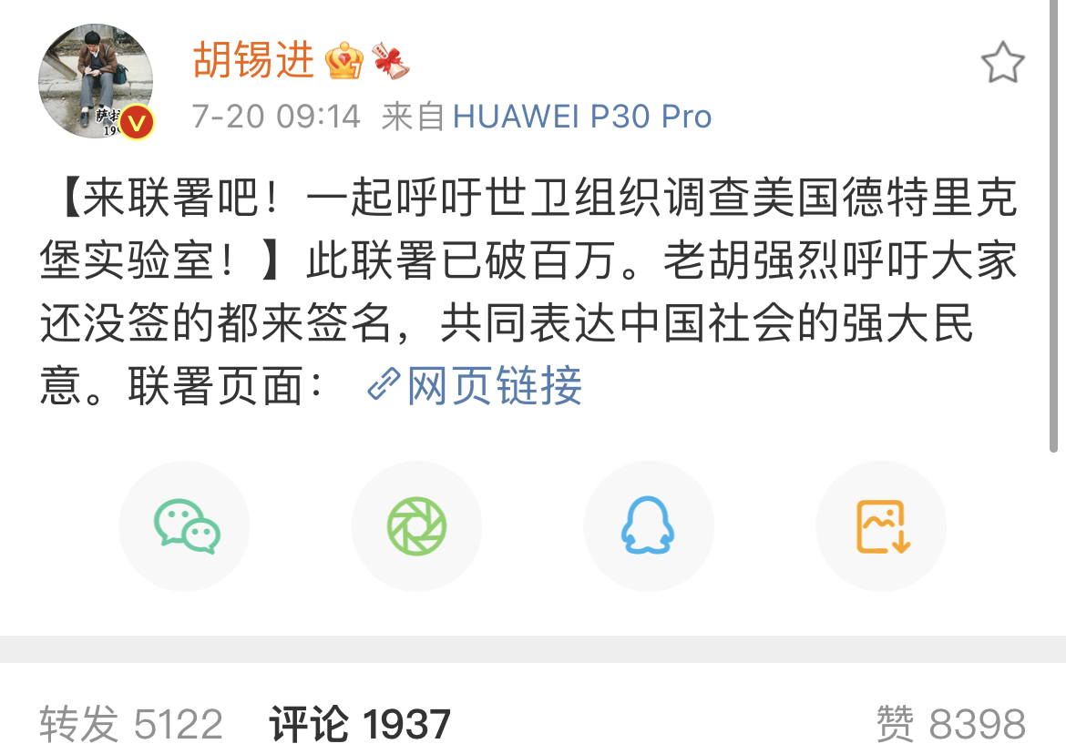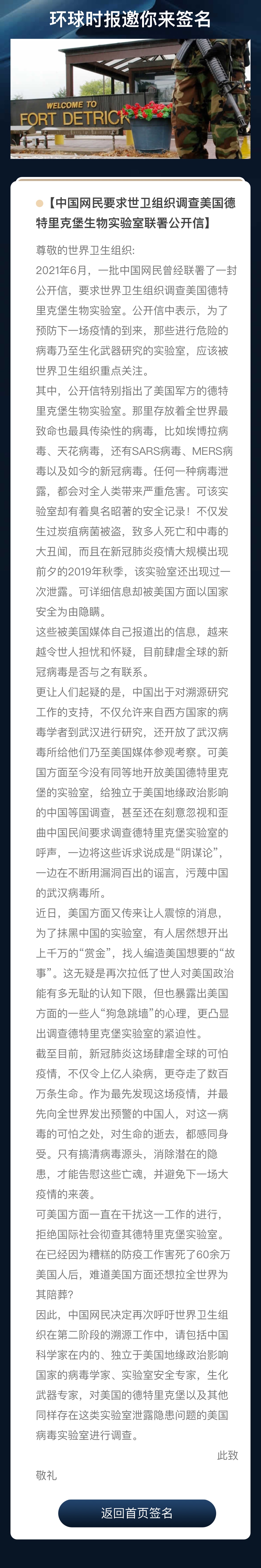 據環球時報報道,這封公開信於今年6月由多名中國網民發起,信中稱為預防下一場疫情的到來,那些進行危險病毒研究的實驗室應該被世衞組織重點關注,其中特別提及了美國軍方的德特里克堡生物實驗室。