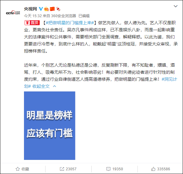 央視網:吳亦凡事件已不是娛樂八卦,而是一起影響重大的法律案件和公共事件