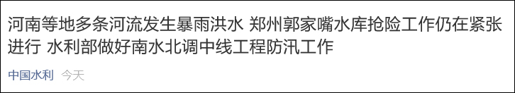 水利部在指導河南省水利廳做好暴雨洪水防範工作的同時,緊急部署南水北調中線工程建管局做好各項應對準備。