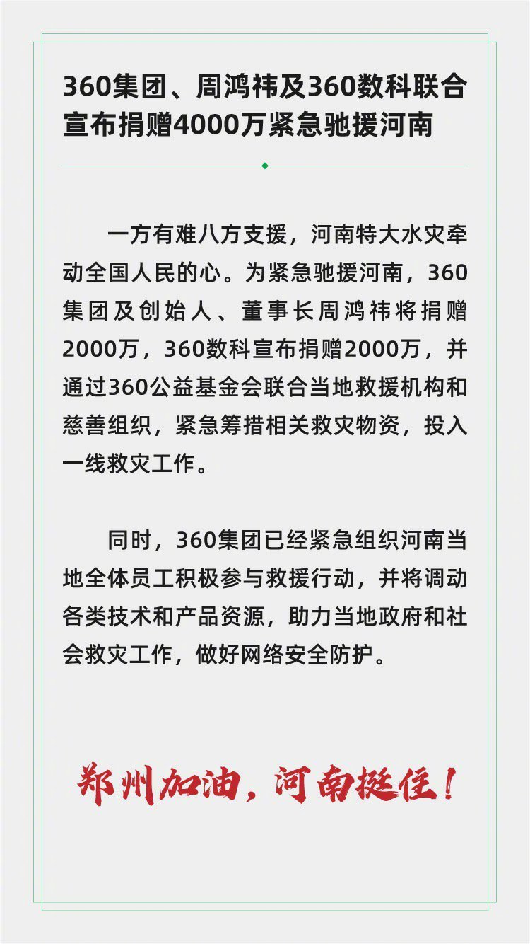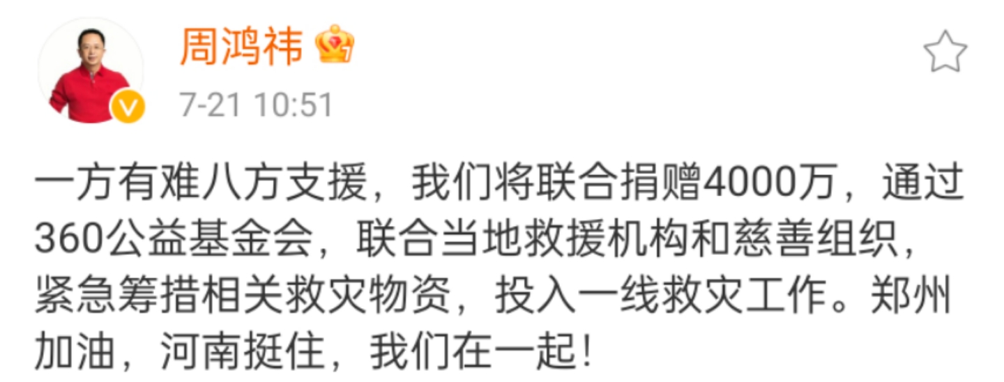 “一方有難八方支援,我們將聯合捐贈4000萬,通過360公益基金會,聯合當地救援機構和慈善組織,緊急籌措相關救災物資,投入一線救災工作。鄭州加油,河南挺住,我們在一起! ”7月21日上午,360集團創始人、董事長周鴻禕在個人微博中説道。