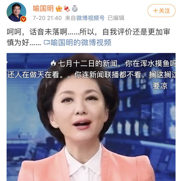 而在河南暴雨的當下,@喻國明 轉發了這段視頻,但又沒有在文案中寫明原視頻的具體信息,還寫道“呵呵,話音未落啊……所以,自我評價還是更加審慎為好”。