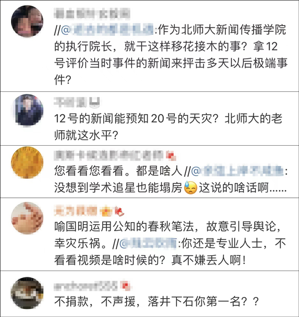 這番操作引來更多批評,其中也有網友仍在好聲好氣地建議@喻國明 不應發佈這類容易引發誤解、對立的信息,當務之急應該優先救災搶險的信息。