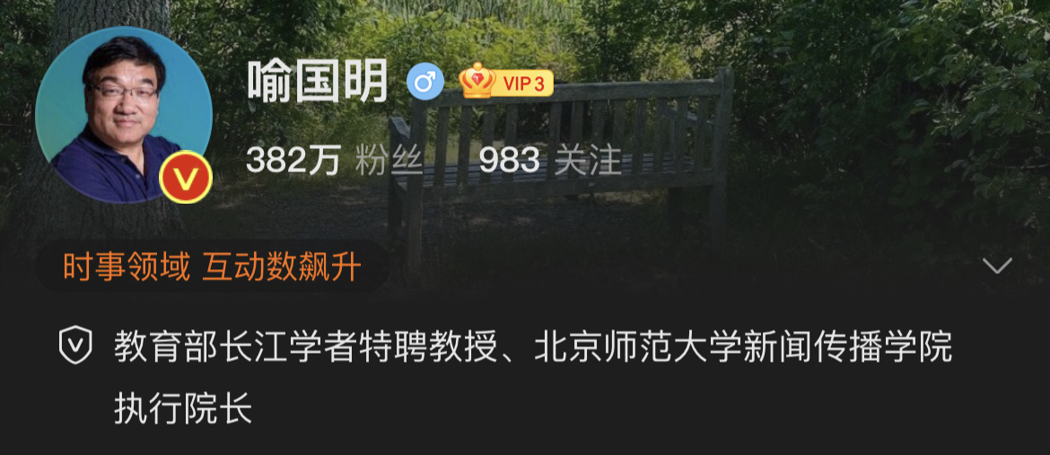 據北京師範大學新聞傳播學院官網介紹,喻國明出生於1957年9月, 1989年在中國人民大學研究生畢業,法學(新聞學)博士。目前他是博士生導師,教育部長江學者特聘教授,享受國務院特殊津貼專家。微博認證還顯示他是北京師範大學新聞傳播學院的執行院長。