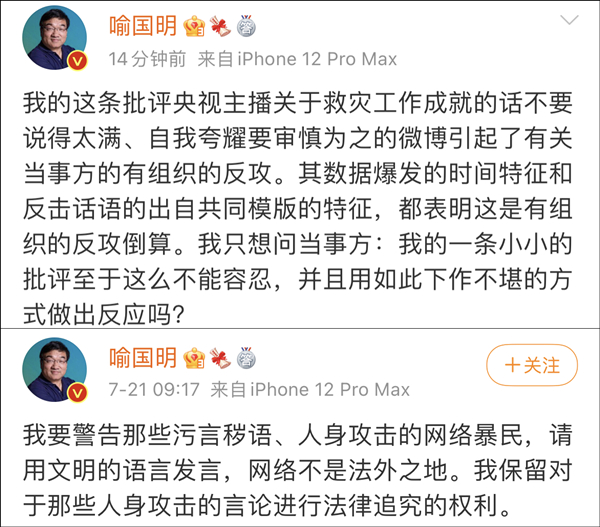21日一早,引發眾怒的@喻國明 兩次轉發爭議博文,表示自己是在批評央視主播對救災工作成就話説得“太滿”,遭到了“有關當事方的有組織的反攻”。在另一條博文中,他還稱有“網絡暴民”對其使用污言穢語進行人身攻擊,將保留法律追究的權利。