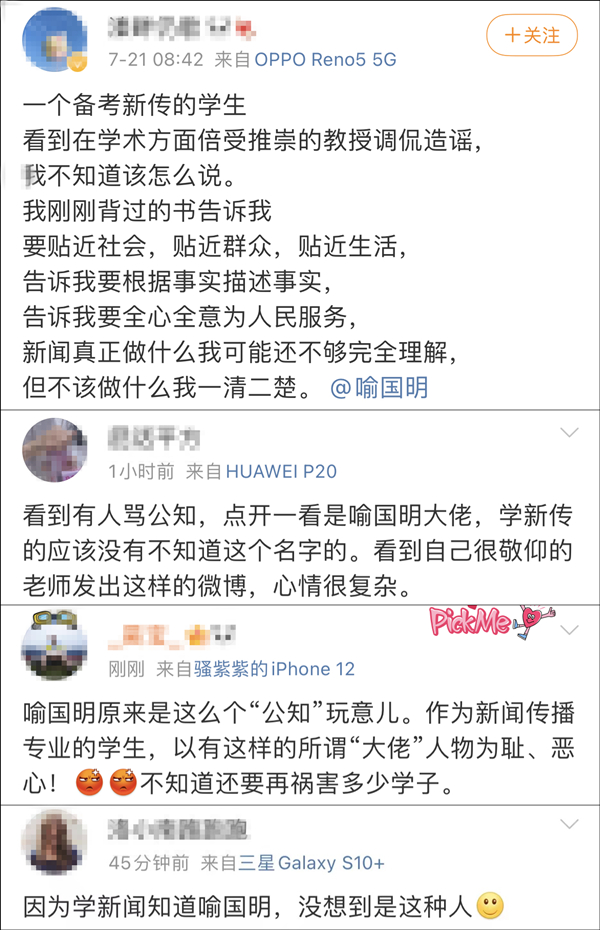 喻國明在新聞傳播專業學生中是極負盛名的名牌教授,這回他的言論也讓不少自稱是新傳專業的學生表示非常失望,他們認為喻國明的這條博文內容相當不妥,違背了尊重事實、強調真實的新聞精神。