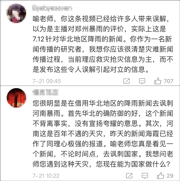 有新視頻不用,卻用一個老視頻來批評發生在河南的新災情,因此@喻國明 此舉被不少網友質疑是在移花接木、張冠李戴。