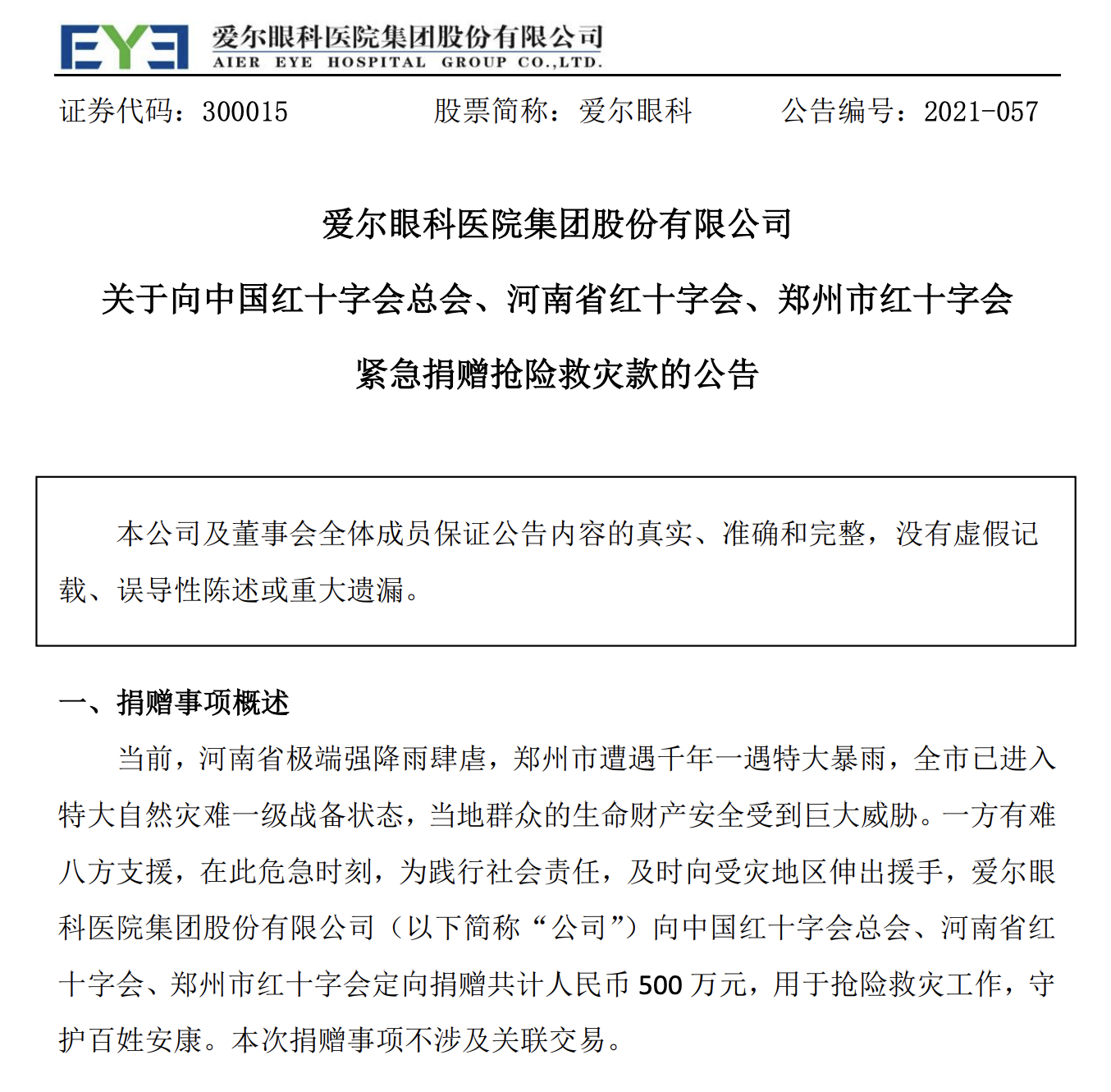 7月21日中午,愛爾眼科發佈公告稱,已向中國紅十字會、河南省紅十字會、鄭州市紅十字會定向捐贈共計人民幣500萬元,用於搶險救災工作。