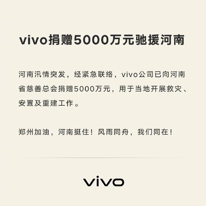7月21日,vivo在官方微博稱,經緊急聯絡,已向河南省慈善總會捐贈5000萬元,用於當地開展救災、安置及重建工作。