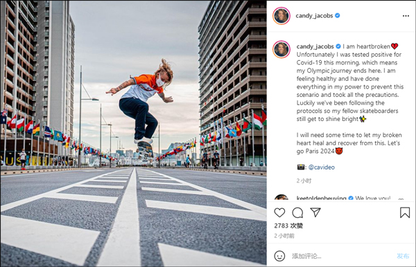 (觀察者網訊)當地時間21日,荷蘭女子滑板運動員肯迪·雅各布斯(Candy Jacobs)在社交平台Instagram上發文表示,自己因新冠檢測結果呈陽性將從東京奧運會退賽。