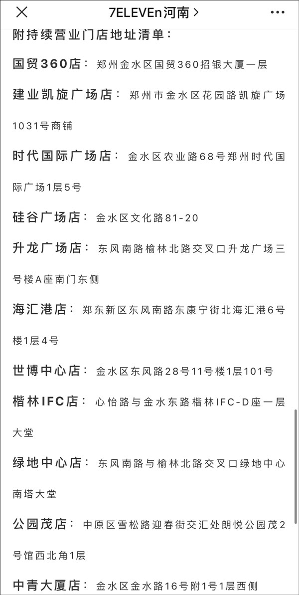 該連鎖便利店在鄭州有14家門店,目前持續營業的有11家,被困市民可就近尋求幫助。