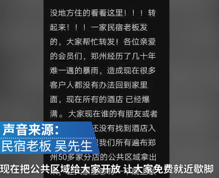 據澎湃新聞7月21日報道,20日,鄭州一民宿老闆吳先生主動開放50家分店供人避險,由於牀位大部分已經滿了,民宿開放公共區域讓大家免費就近歇腳。