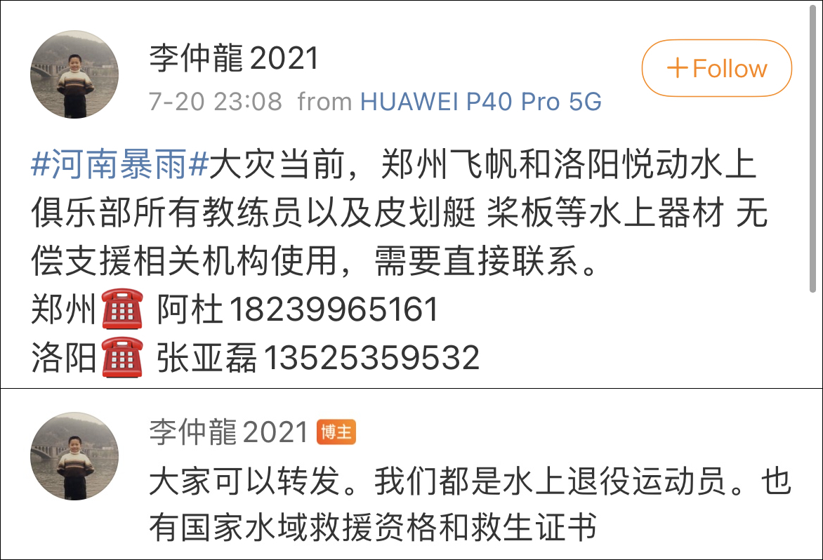 面對嚴重的內澇,水上項目的經營者同樣希望貢獻自己的力量。原河南皮劃艇激流回旋運動員@李仲龍2021 第一時間在微博發文表示,鄭州和洛陽兩家水上俱樂部願意將皮划艇、槳板、救生衣等水上器材無償支援相關機構使用,水上俱樂部的教練員還會提供專業知識。