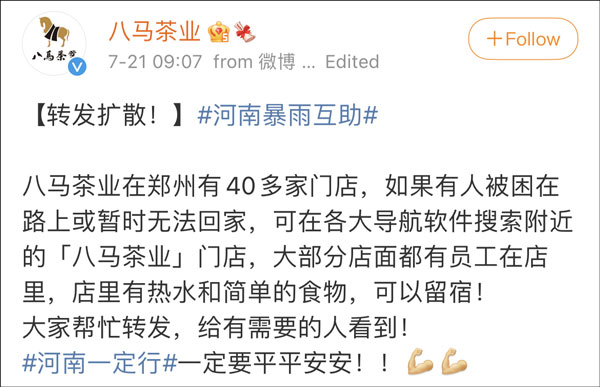 險情面前,不止一家連鎖企業站了出來。21日,一家茶葉連鎖企業在微博發佈互助消息,該企業在鄭州有40多家門店,如果有人被困在路上或暫時無法回家,可在任一門店留宿,大部分店面都有員工在店裏,店裏有熱水和簡單的食物。
