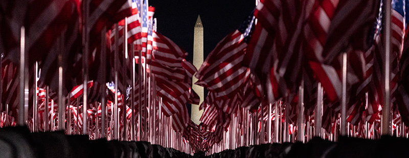 今年1月18日,拜登就職典禮倒計時,華盛頓國家廣場插上美國國旗,代表因疫情無法參與就職典禮的美國人,悼念新冠疫情死難者 東方IC圖