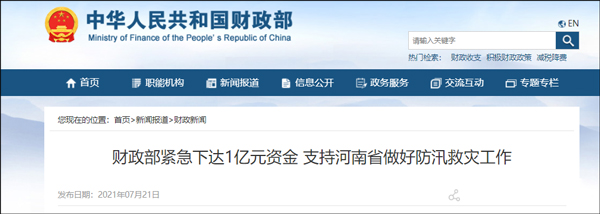 財政部網站7月21日消息,為貫徹落實習近平總書記重要指示精神,按照國務院常務會議部署要求,7月21日財政部緊急下達1億元救災補助資金,支持河南省做好防汛救災工作。