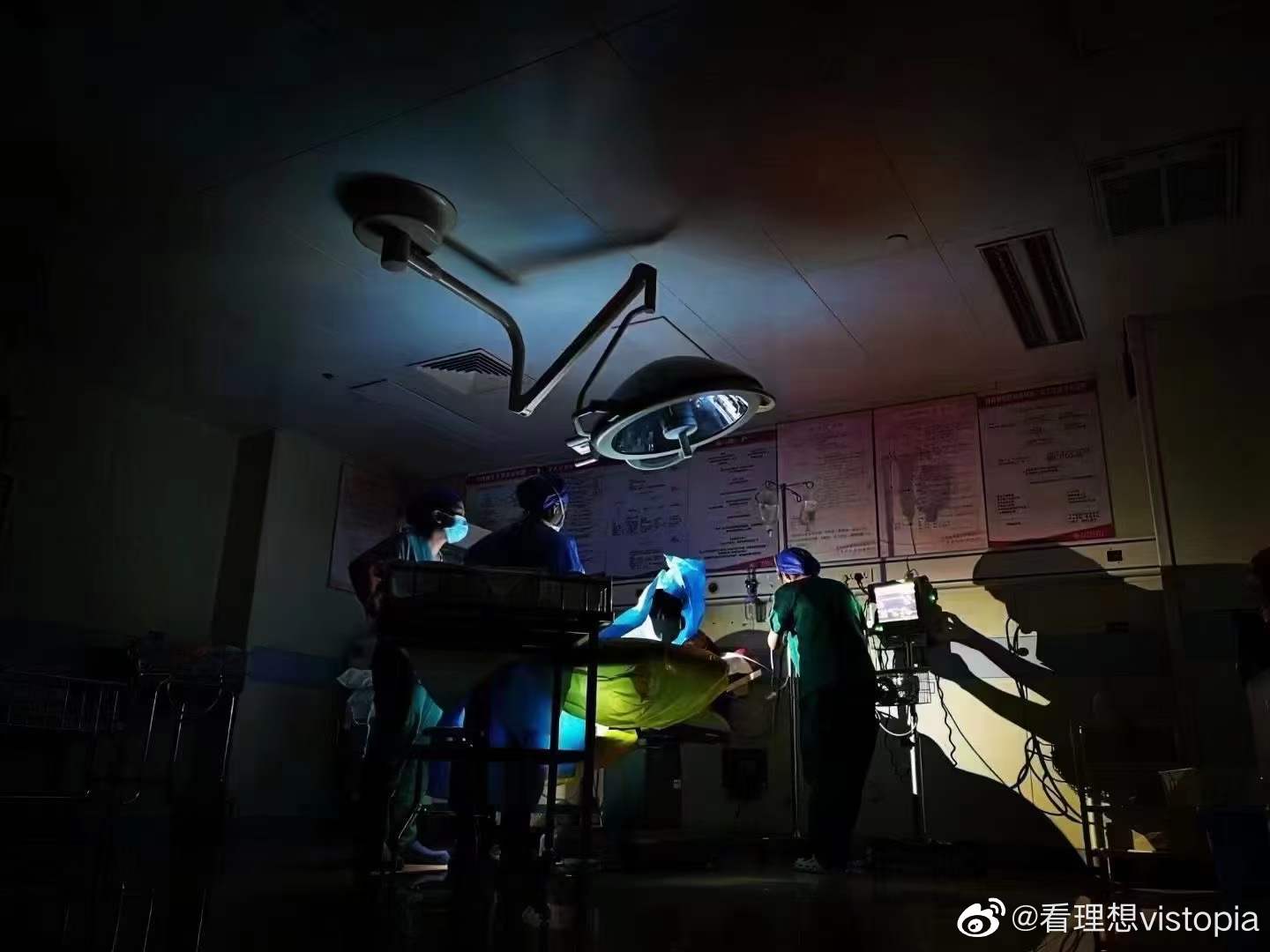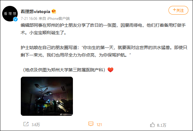 據@看理想vistopia 官方微博,20日,因暴雨停電,鄭州大學第三附屬醫院(河南省婦幼保健院)產科的醫生護士們打着備用燈做手術,最終母子平安,成功接生。