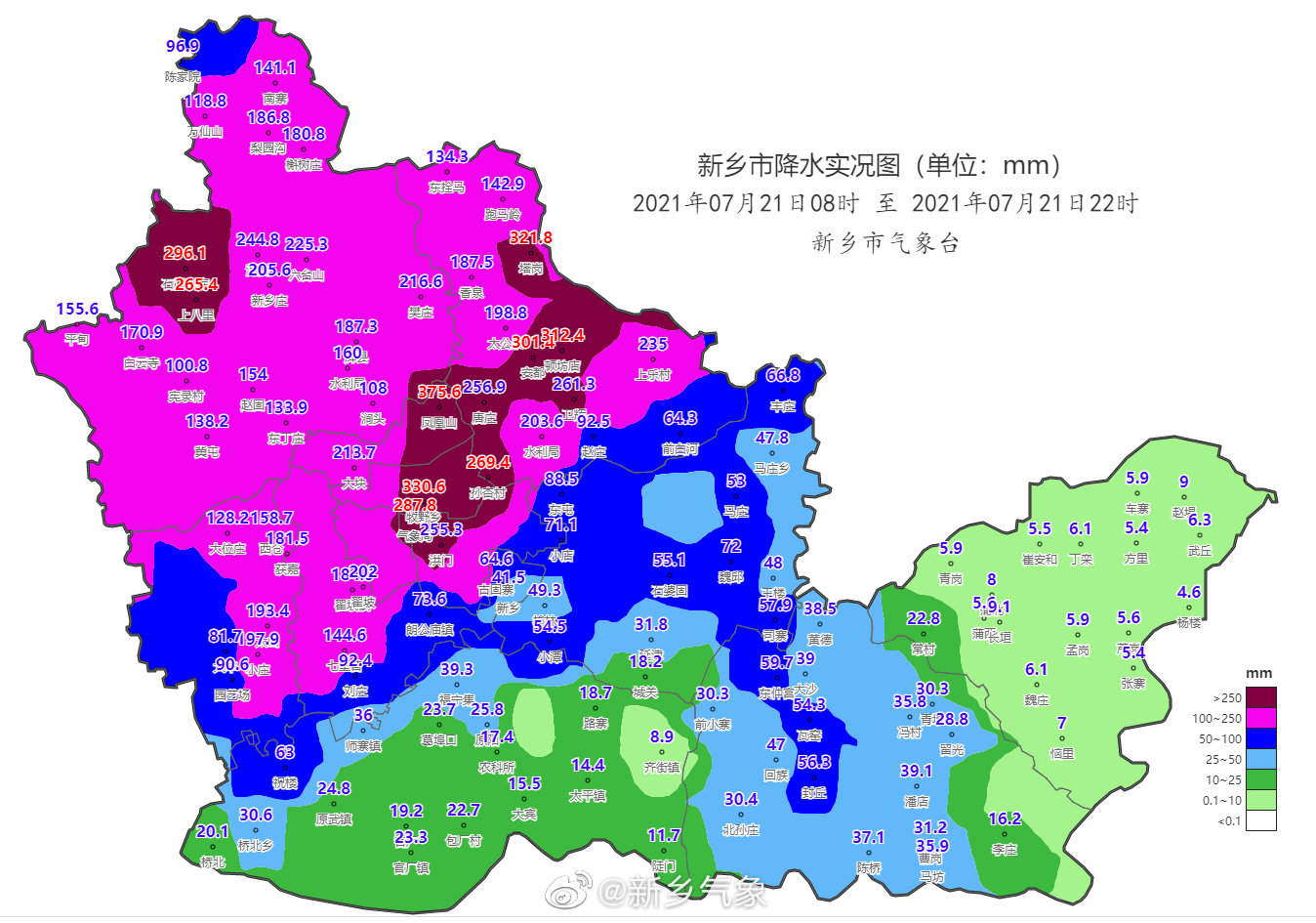 7月21日08時至22時,新鄉市北中部出現暴雨、大暴雨、局地特大暴雨天氣,有14個站點達到特大暴雨(≥250mm),49個站點達到大暴雨(100-250mm),34個站點達到暴雨(50-100mm)。雨量(單位:mm)最大的5個站點依次為:市區的鳳凰山375.6、牧野343.2、牧野鄉330.6和衞輝塔崗321.8、頓坊店312.4。最大小時雨強出現在新鄉市區的牧野鄉149.9mm(20-21時)和牧野131.1mm(19-20時)。
