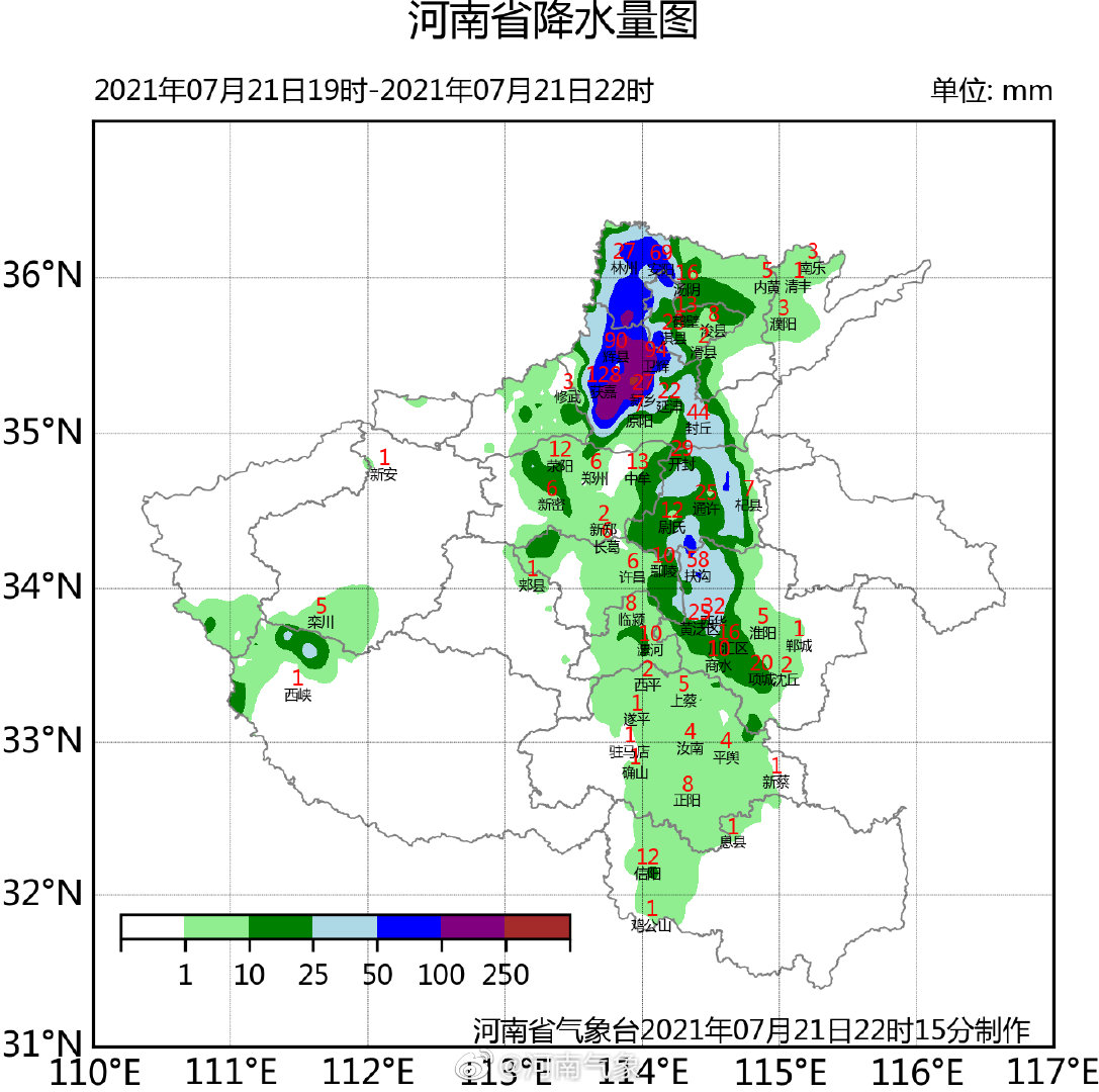 @河南氣象 稱,截至 21日20時監測顯示,河南省有鄭州、新密、嵩山、滎陽、鞏義、淇縣、焦作、衞輝、修武、鶴壁、臨潁、新鄭、扶溝、偃師、博愛、獲嘉、魯山、登封、中牟、武陟、開封、温縣、許昌、汝州、沁陽、郟縣、通許等27個國家級氣象站突破建站以來最大連續3日降水量歷史極值。