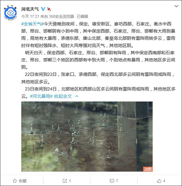 另據河北省氣象局官方微博@河北天氣 21日晚消息,河北今晚將迎來局地大暴雨。