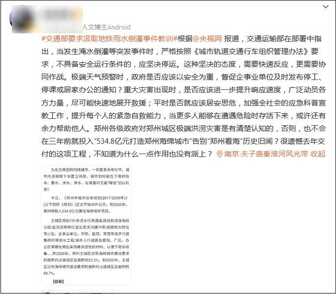 大V質疑鄭州“海綿城市”建設失效,專家:不能應對特大暴雨
