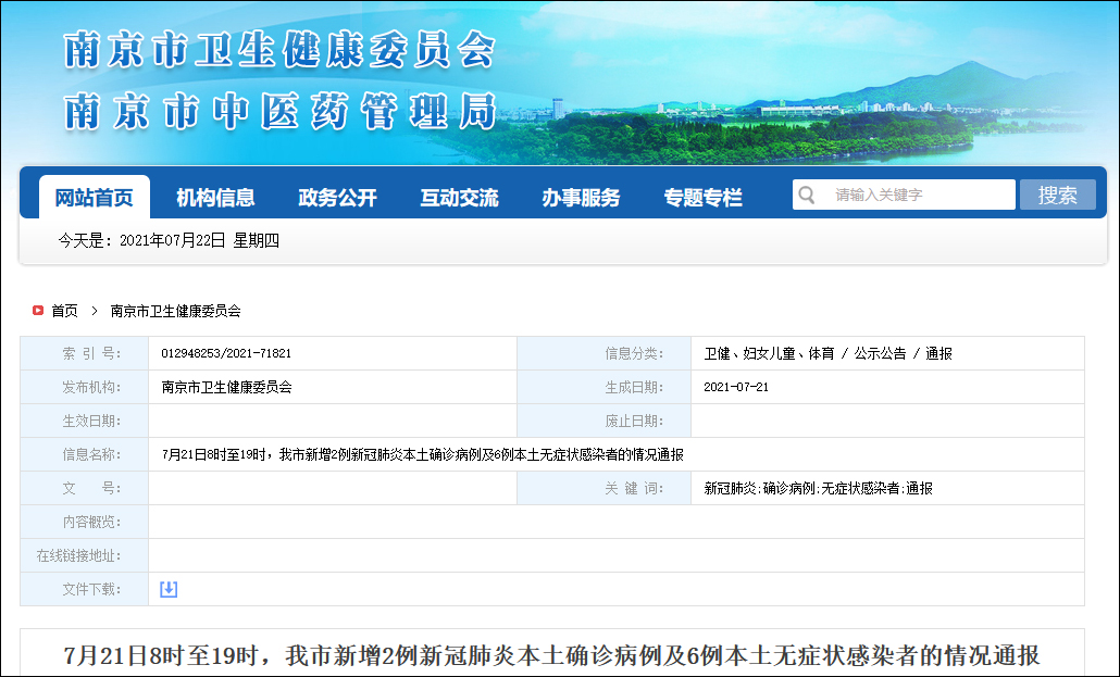 7月21日,南京市衞健委發佈7月21日8時至19時,我市新增2例新冠肺炎本土確診病例及6例本土無症狀感染者的情況通報。以下為全文: