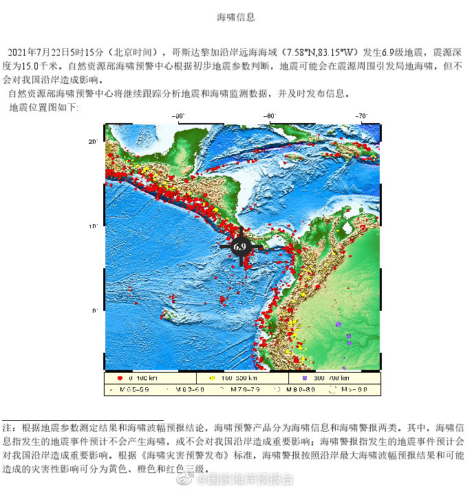 哥斯達黎加沿岸遠海海域發生6.9級地震 震深15千米 None 2021-07-22 據@國家海洋預報台 消息,【海嘯信息】2021年7月22日5時15分(北京時間),哥斯達黎加沿岸遠海海域(7.58°N,83.15°W)發生6.9級地震,震源深度為15.0千米。