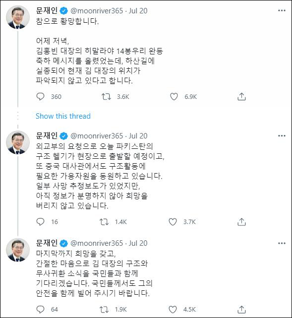韓國總統文在寅也在其社交媒體上連發三推,稱韓國駐巴基斯坦使館已趕赴現場,駐中國使館也動用了一切可用資源。他明確不會放棄希望,將與韓國國民一起期待金洪彬獲救並平安歸來的消息,並表示希望民眾可以為他祈禱。