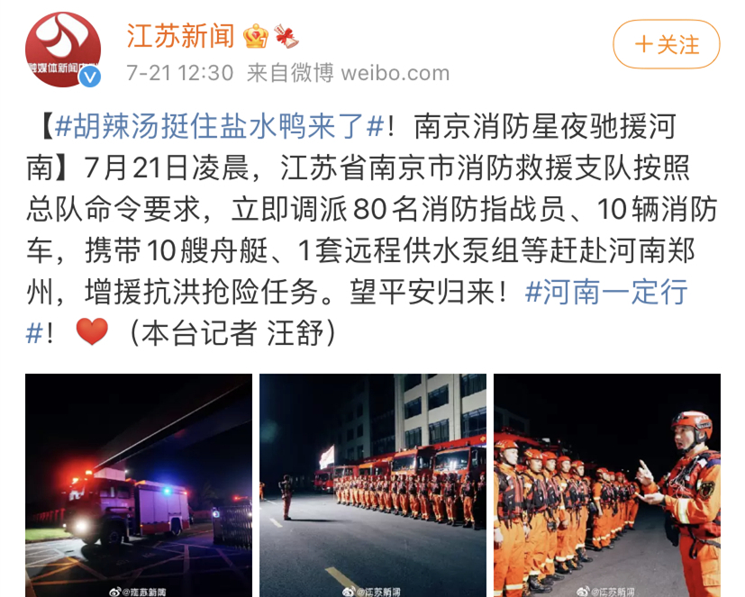 @江蘇新聞 昨天發佈南京消防星夜馳援河南的新聞下,位居第一、點贊量高達4.1萬的熱評就是:他來了他來了,“散裝江蘇”他來了。