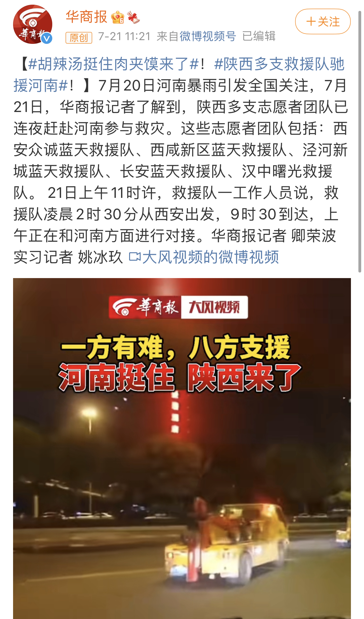 這個操作也沿用到了此次抗擊洪災中,20日晚緊急集結後,各地救援代表隊在前往河南受災地區時,幾乎都會用上一句“胡辣湯挺住XXX來啦”的句式。