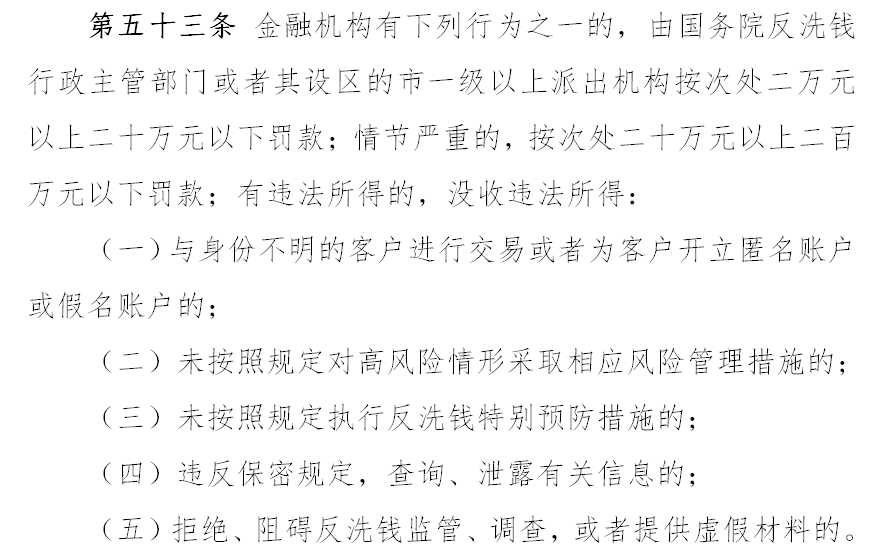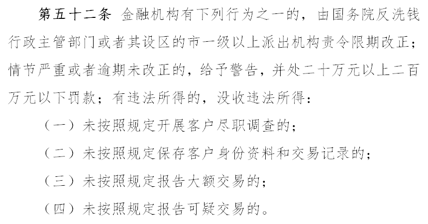 其中,第五十二條規定,金融機構存在未按照規定開展客户盡職調查的、未按照規定保存客户身份資料和交易記錄的、未按照規定報告大額交易的、未按照規定報告可疑交易的等行為的,由國務院反洗錢行政主管部門或者其設區的市一級以上派出機構責令限期改正;情節嚴重或者逾期未改正的,給予警告,並處二十萬元以上二百萬元以下罰款;有違法所得的,沒收違法所得。