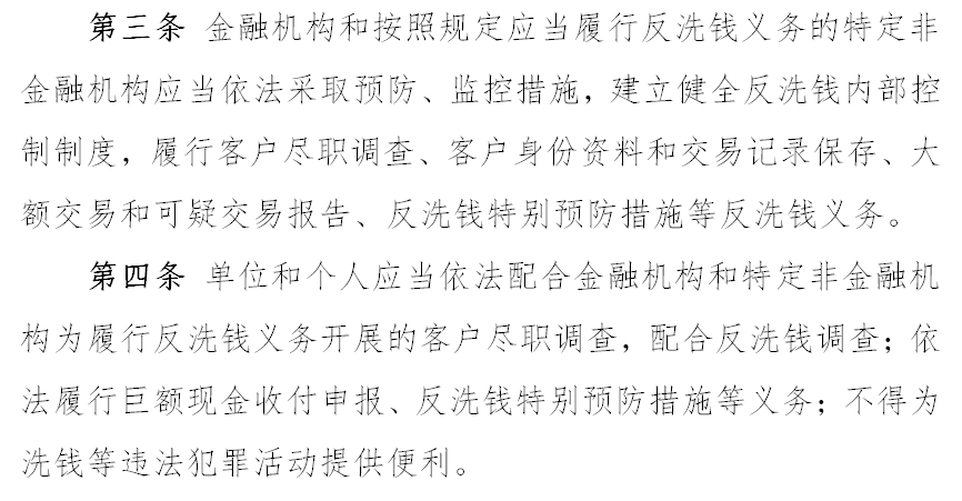 6月1日,中國人民銀行發佈《中華人民共和國反洗錢法(修訂草案公開徵求意見稿)》明確,金融機構、特定非金融機構應當依法採取預防、監控措施,建立健全反洗錢內部控制制度,履行客户盡職調查、客户身份資料和交易記錄保存、大額交易和可疑交易報告、反洗錢特別預防措施等反洗錢義務。