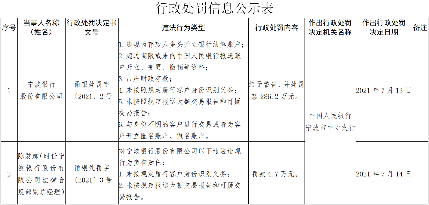 (文/陳墨 編輯/尹哲)7月21日,中國人民銀行寧波中心支行發佈行政處罰公告,寧波銀行因違反多項反洗錢規定收到總額286.2萬元罰單。