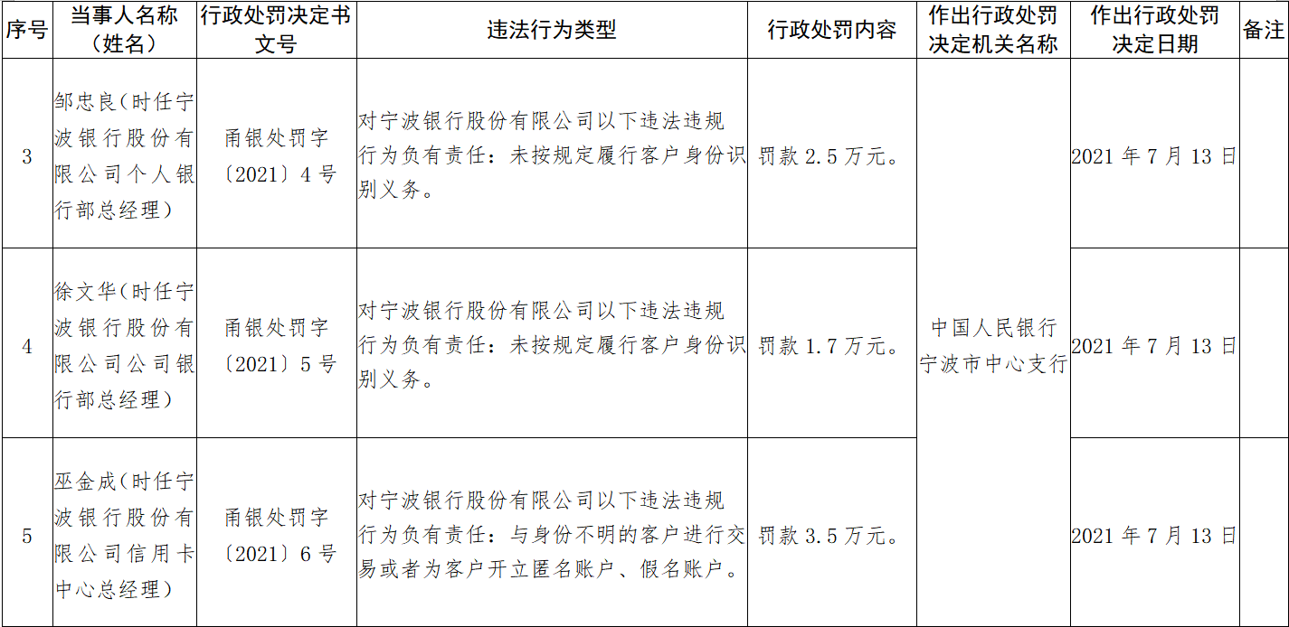 與此同時,寧波銀行法律合規部、個人銀行部、公司銀行部、信用卡中心等部門時任總經理也一同收到了1.7萬元-4.7萬元不等的罰單。