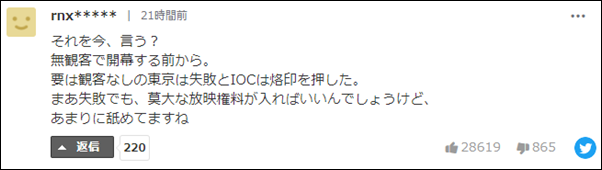 熱評第一的日本網民憤憤不平地説,國際奧委會的做法就是在給日本打上失敗的烙印。“現在,就在(日本)空場辦奧運前,説這話?**國際奧委會這是要給沒有觀眾的東京奧運會打上失敗的烙印。**就算失敗了,能收到可觀的轉播費不就可以了。太小看人了。”