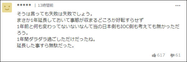 也有日本網民乾脆“躺平任嘲”,認為無論怎麼説,失敗就是失敗。“**就算這麼説,失敗就是失敗吧。**推遲了一年,事態不但沒有解決,連好轉都沒有,和一年前比,一點變化都沒有。這點日本和國際奧委會都沒有考慮到吧。只是拖拖拉拉地過了一年。推遲一點用都沒有。”