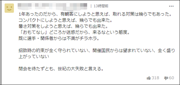 “(明明)有一年時間,如果想有觀眾、想精簡、想防暑的話,也來得及採取一些政策了。但是,別説有什麼“招待”了,因為覺得很麻煩,乾脆就擺出一副‘別來’的態度。選手和相關人員積攢了一堆不滿。完全沒有遵守申奧時的約定,舉辦國的人民都沒啥期待,完全不熱鬧,沒有氣氛。即使還沒有閉幕,也可以説是世紀大失敗。”