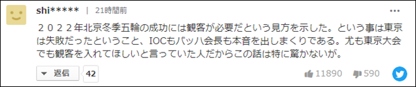 新聞非常簡短,但底下日本網民的評論卻很“熱鬧”。很多日本網民説,國際奧委會的意思就是,對奧運會的成功來説,觀眾非常重要,這不明擺着在説東京奧運會“失敗”嗎?言語中隱約透着一股“酸”味兒。