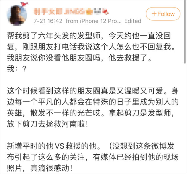 21日下午,一名合肥網友在微博發文稱,幫她剪了六年頭髮的髮型師當天下午一直不回覆預約消息,打電話也不接,被朋友提醒才去看了他的朋友圈,原來,他去河南參加救援了。
